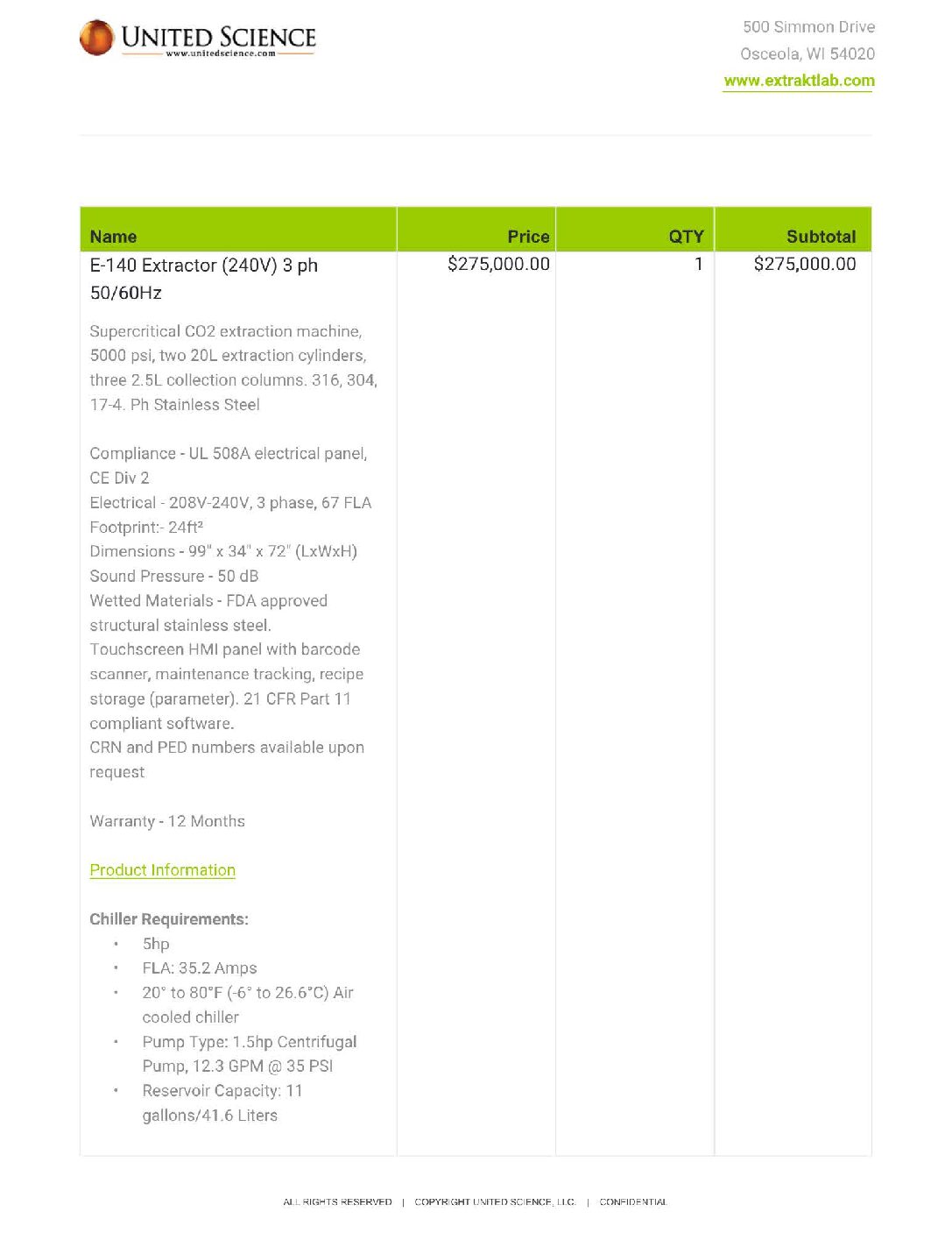 Sound Pressure (db) <50 CERTIFICATIONS, Listed: UL 508A, CE, PED REGULATORY COMPLIANCE: 21 CFR Part 117, 211, 177 and Health Canada equivalents, P.E. stamped according to ASME DIV II VII-2 PED compliant, CE marked, notified body Lloyd’s Register, CRN number ALSO AVAILABLE, SOLD SEPARATELY: GMP Documentation Package; Commissioning and Training Package; Maintenance Package (12 Months) Specs 2: Chiller, 5hp (230V) 3ph Extractor Chiller E-110/E-140/E-180 5 HP Chiller for the E-140/E-180 extractor. Air cooled chiller with set point range of 20° to 80° F (-6° to 26.6°C) Supports up to two E-140 extractors, or one E-180 extractor. Also Required: #10-1031 I Chiller Connection Kit Electrical: (V /Ph/Hz) 230V, 3 phase, 60Hz FLA: 35.2 Amps Pump type: 1.5 HP centrifugal pump, 12.3 GPM@35 PSI Reservoir Capacity: 11 gallons/ 41.6 Liters Dimensions: 48″ x 35″x 61″ (LxWxH) Cooling Capacity: 5.1 Tons / 61,200 BTU/hr / 17. 9 kW @ 1 0C process, 35C ambient temperature.