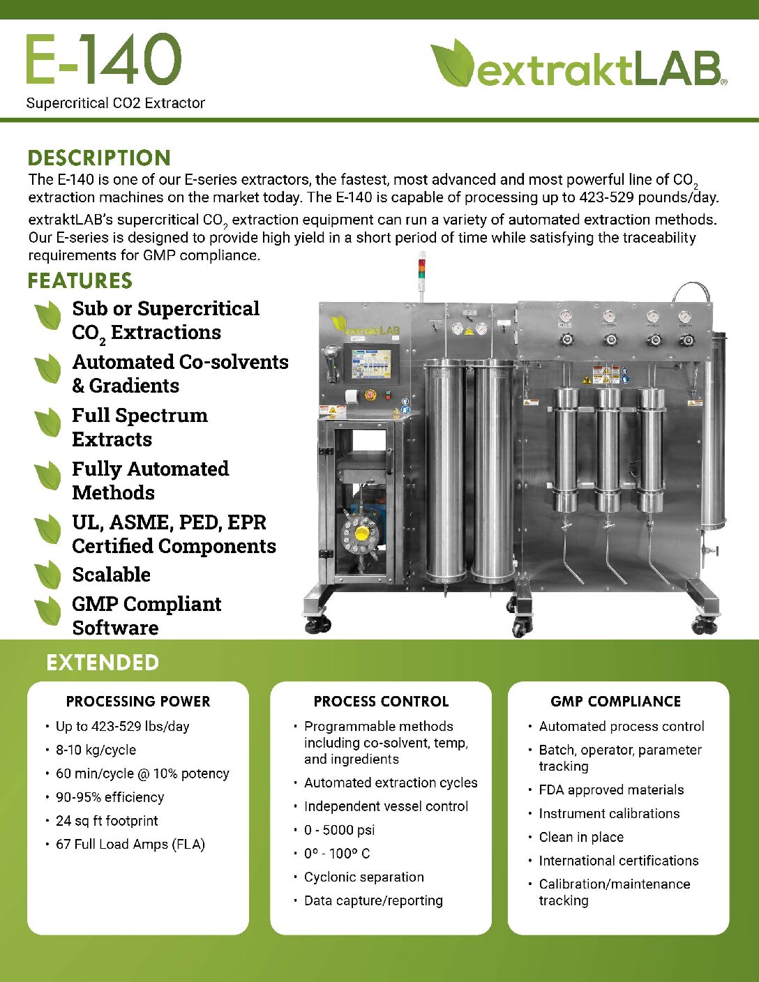 Programmable methods including co-solvent, temp, and ingredients; Automated extraction cycles; Independent vessel control; 0-5000 psi; 0-100ºC; Cyclonic separation; Data capture/reporting