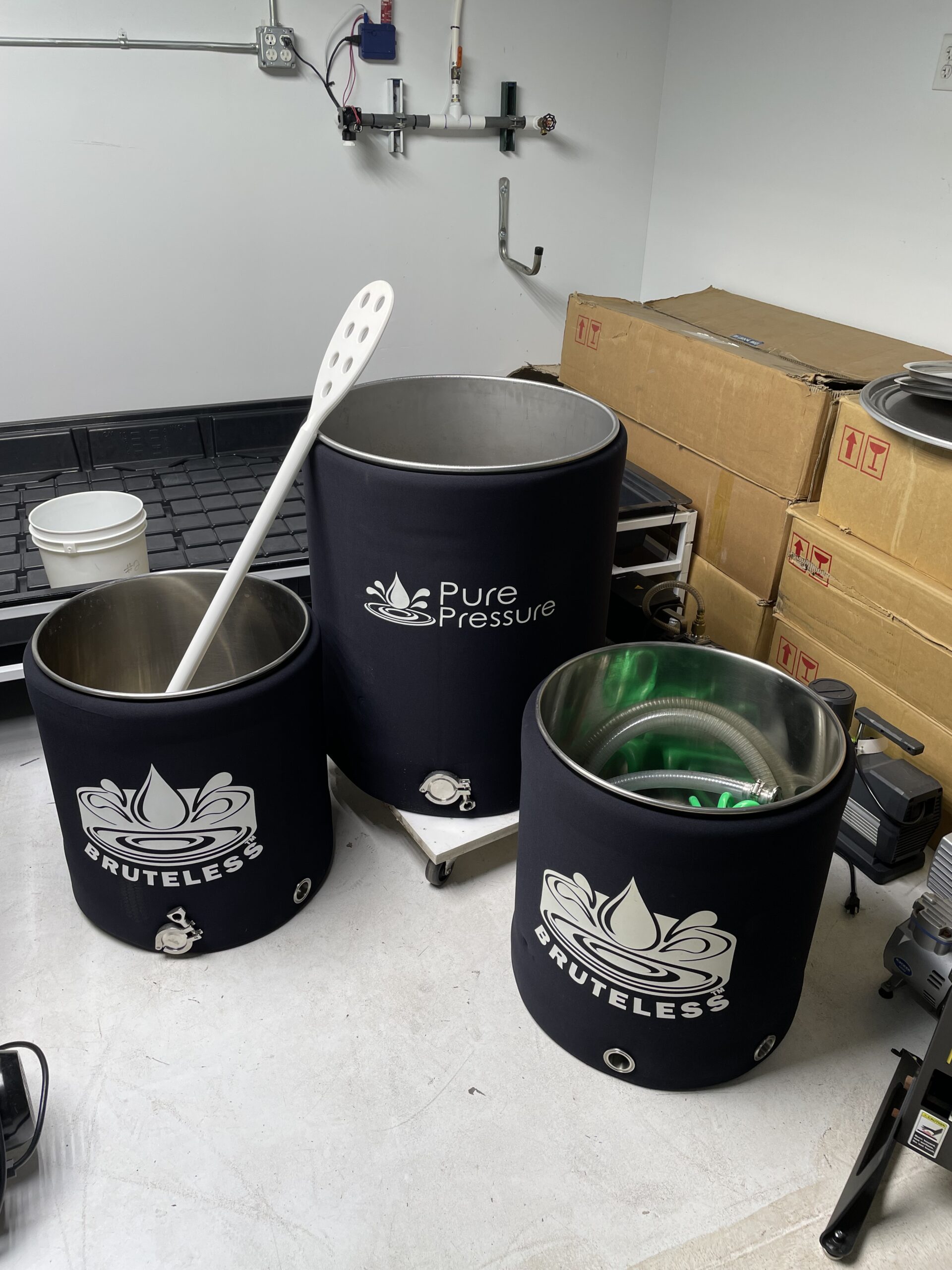 PurePressure Bruteless Base Hash Washing System — stainless steel, closed-loop agitation and drain setup for bubble hash or ice-water washing, ideal for small-scale solventless extraction operations. Includes Boldtbags 30 gallon kit!